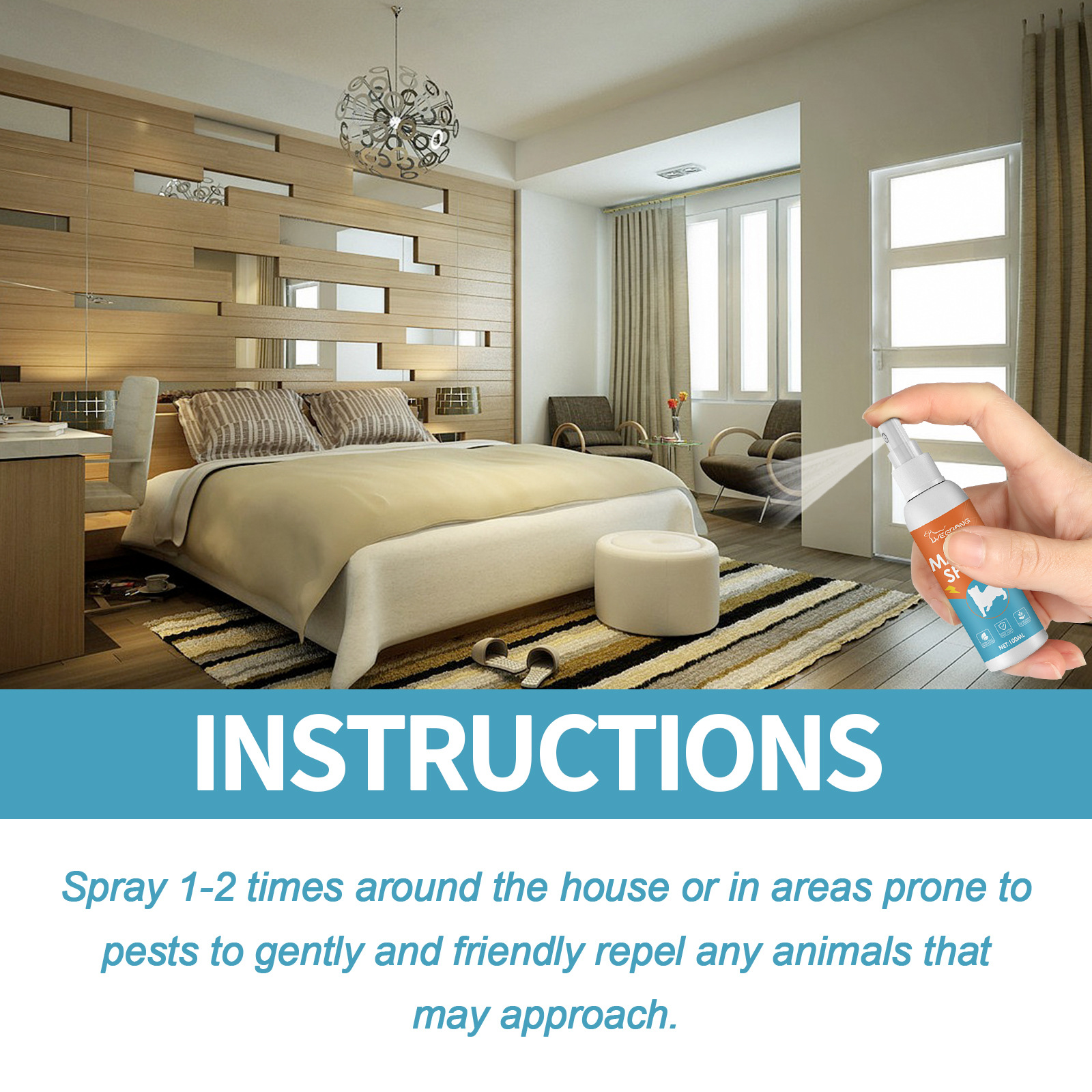 * Spray 1-2 times around the house or in areas prone to pests to gently and friendly repel any animals that may approach.