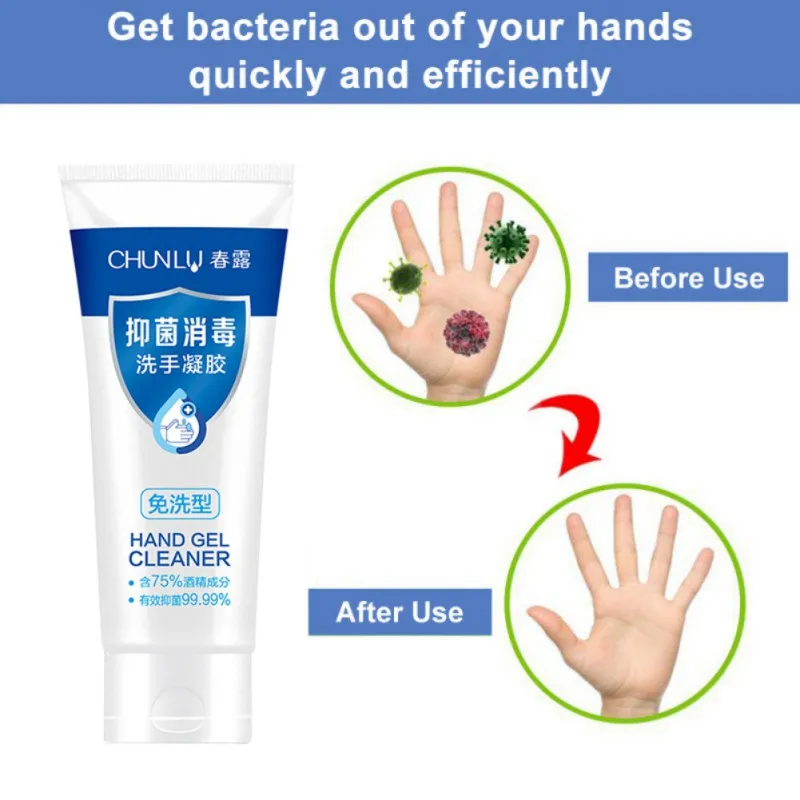 Specifications: Net content: 100ml Ingredients: Carbomer, Aloe Gel, Triethanolamine, Glycerin How to use: Take an appropriate amount (2-3ml) of the product to moisten your hands and rub for 15 seconds until the liquid covers your hands, wait for drying, and do not wash with water. Function: Effectively eliminate most pathogenic microorganisms, such as E. coli, Staphylococcus aureus, etc. 1. Can effectively and quickly kill germs, fungi, cocci, and viruses, etc., 2. Gentle and non-irritating, does not hurt the skin, has water-holding and moisturizing function 3. Do not wash with water, easy to save water 4. Small size, easy to carry 5. Gel texture, you can easily control the amount Note: This product is for external use. Do not take it internally. Use with caution to people who are allergic to alcohol. Please keep it out of reach of children.
